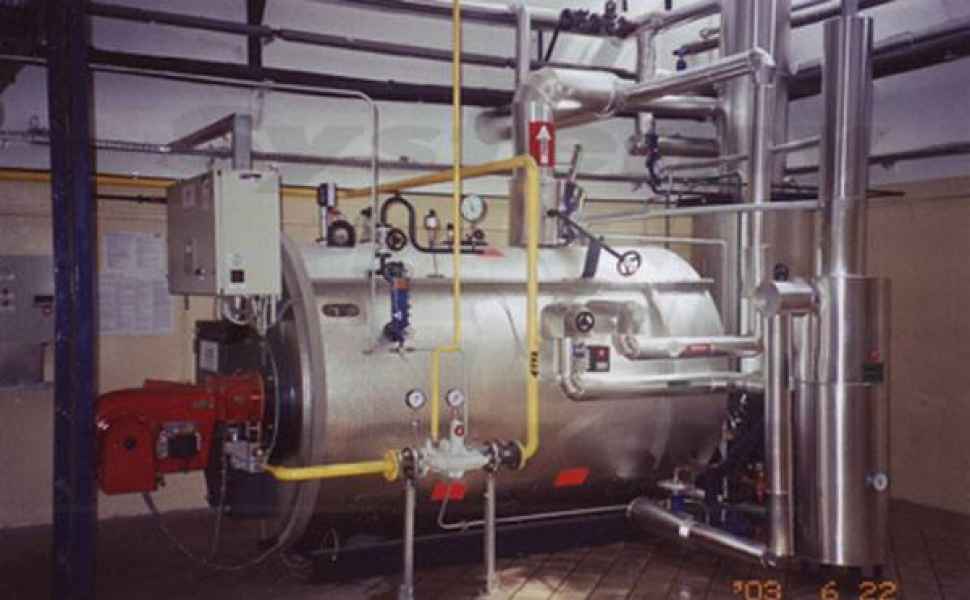 The steam boiler plant, with a capacity of 3 200 kg/h, a pressure of 10 bar, GZ-50 natural gas-fired, for BOMILLA Company. Feed water tank was installed on a support structure (3,5 m above the floor level) in a boiler room.