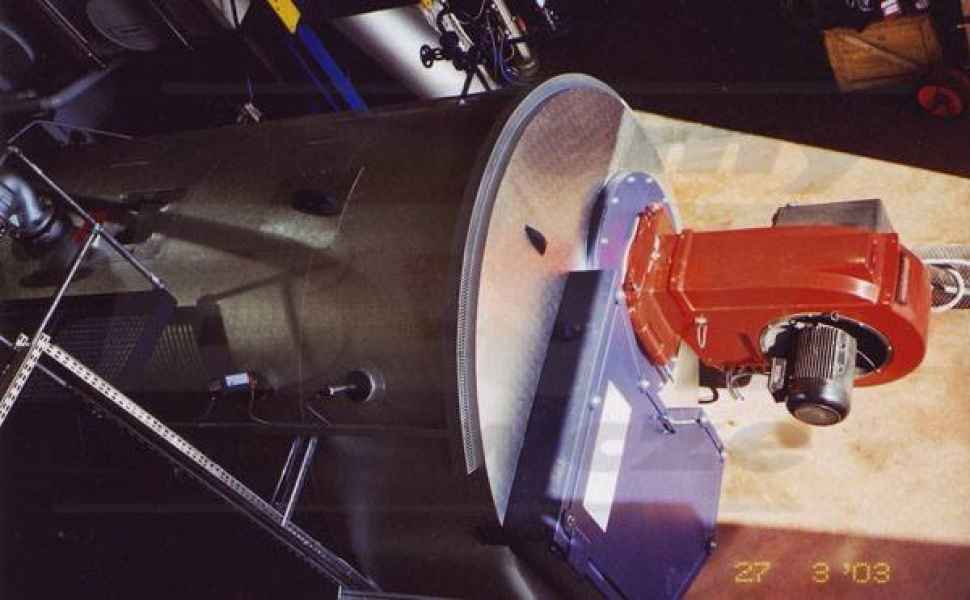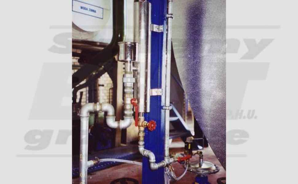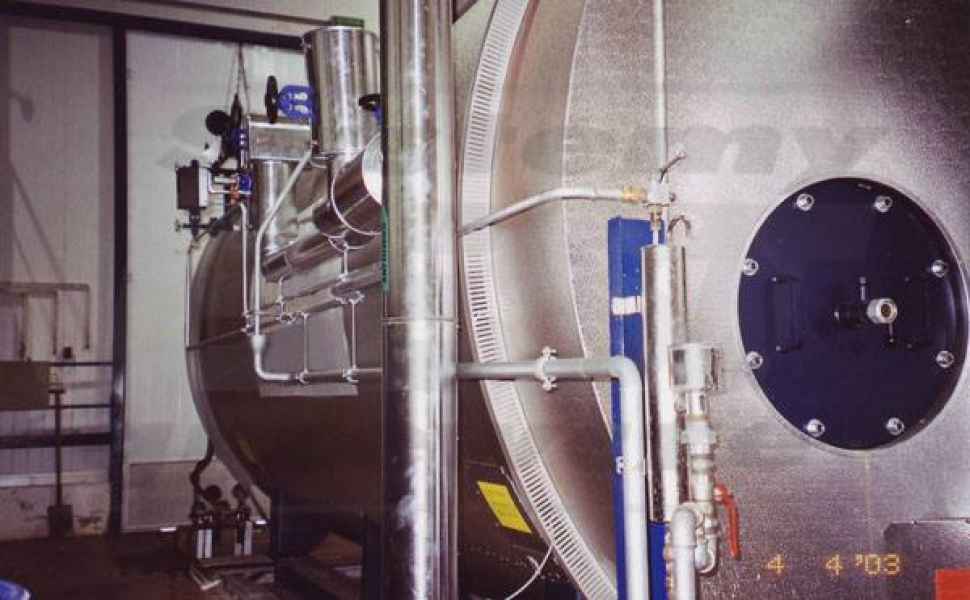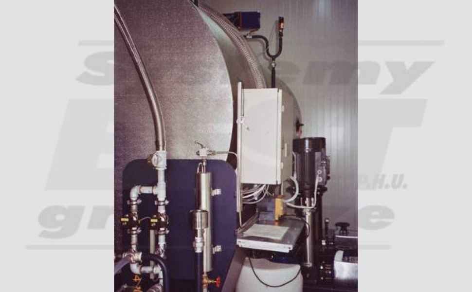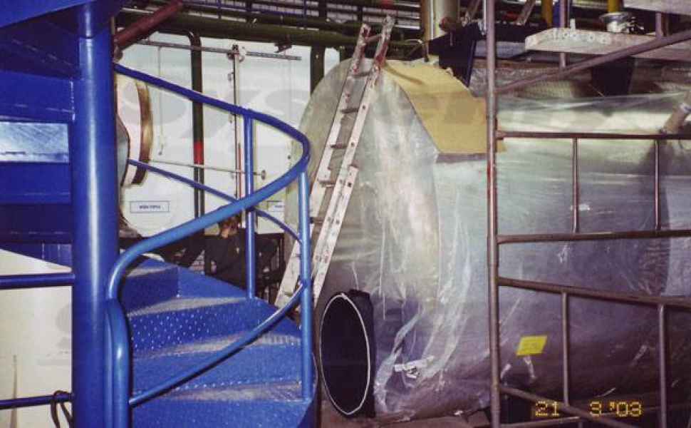The old, destroyed boiler (with a capacity of 10 000 kg/h) was replaced, together with the installation of feed water system, 10 m3/h (the photo below presents the container in front of the boiler plant room), during production break (9 days).