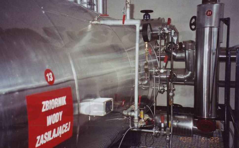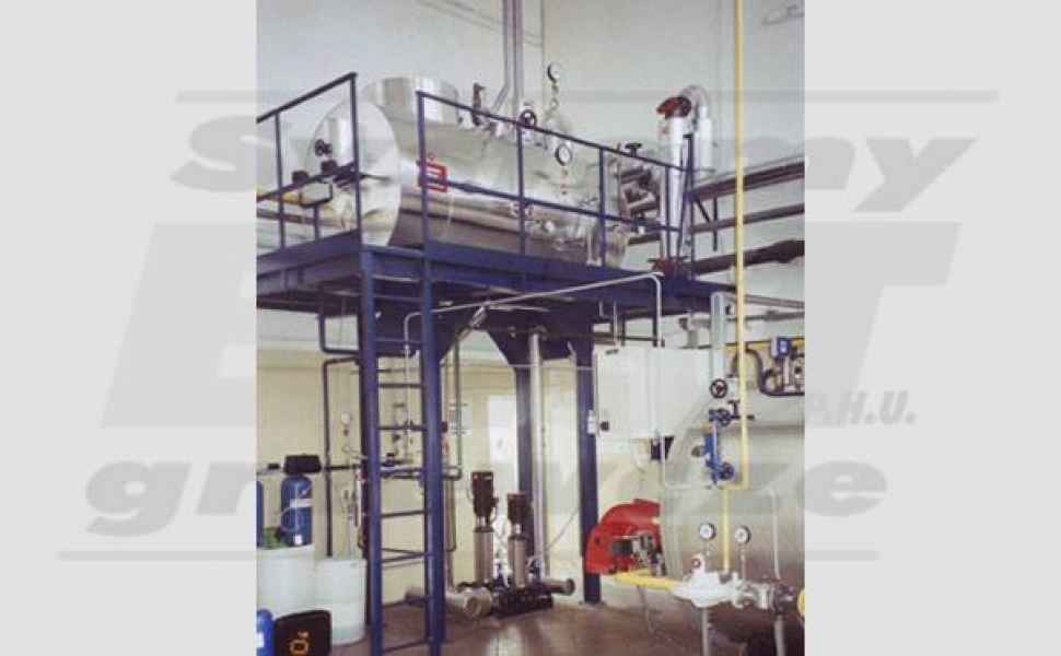 Kotłownia parowa dla zakładów przemysłu spożywczego BOMILLA o wydajności 3 200 kg/h i ciśnieniu 10 bar opalana gazem ziemnym GZ-50. Zbiornik wody zasilającej umieszczony na konstrukcji wsporczej o wysokości 3,5 m nad poziomem posadzki w pomieszczeniu kotłowni.