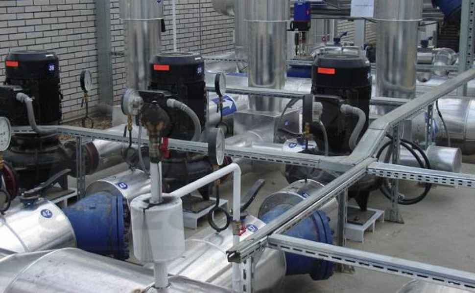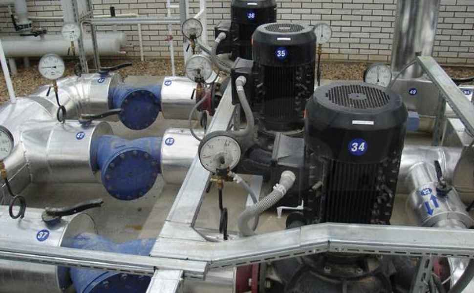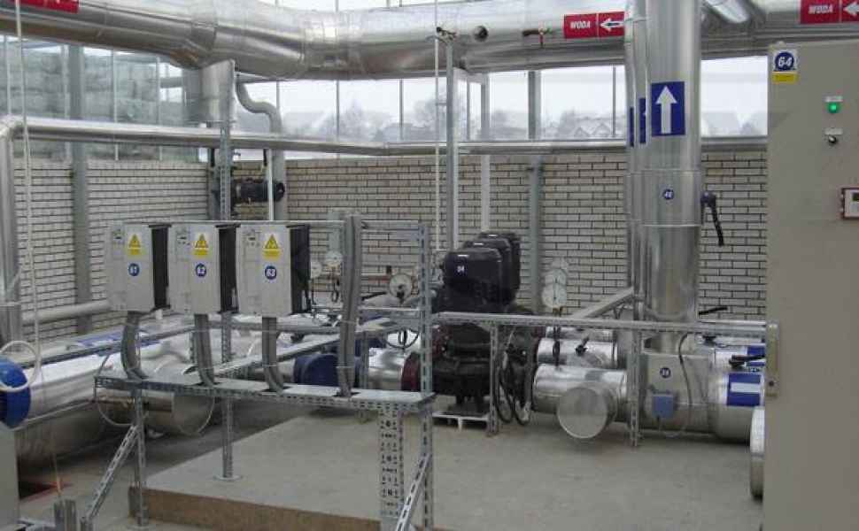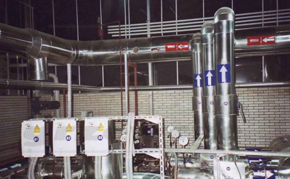 Układ pompowo - transmisyjny wykonany w oparciu o trzy pompy Grundfos - z możliwością rozbudowy o czwartą pompę - realizuje poprzez falowniki i zawory mieszające program zadany przez komputer klimatyczny.